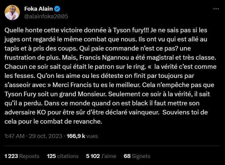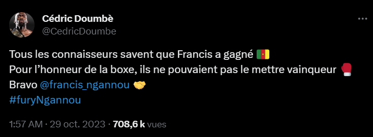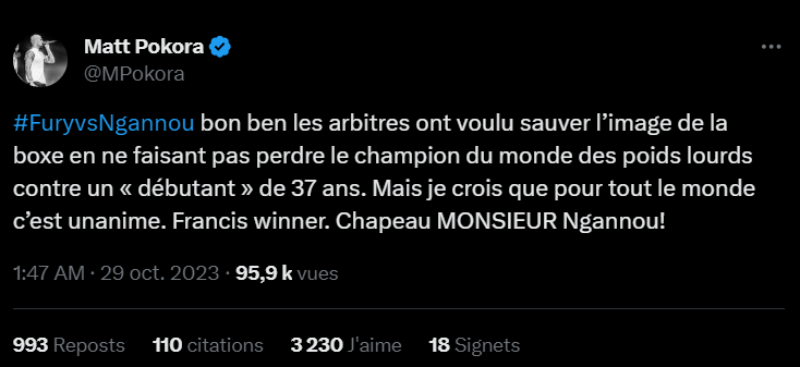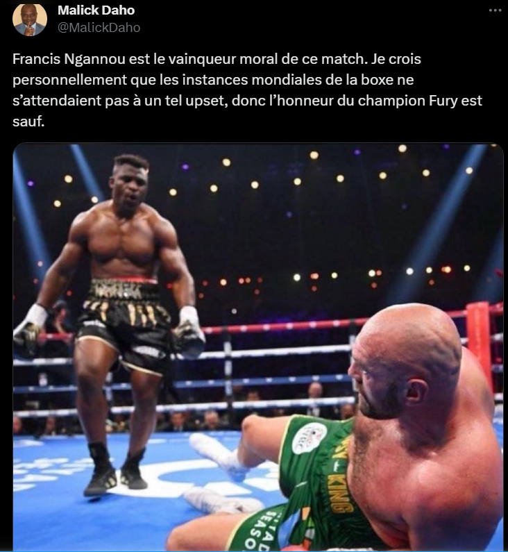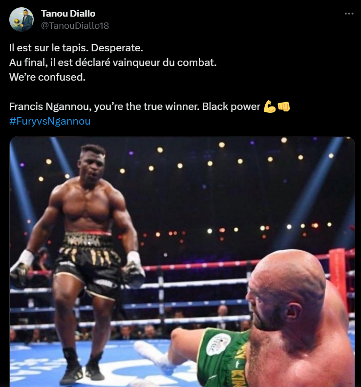 Lors du troisième round, la scène a basculé de manière inattendue. Ngannou a réussi un coup du gauche dévastateur, envoyant Fury au tapis. C’était un moment mémorable qui a ébranlé le champion WBC et a prouvé que Ngannou n’était pas à sous-estimer. Fury a réussi à se relever, mais il n’a jamais pu renverser la vapeur. Au final, les juges ont rendu leur verdict, accordant la victoire à Tyson Fury par décision partagée (95-94, 96-93, 94-94).